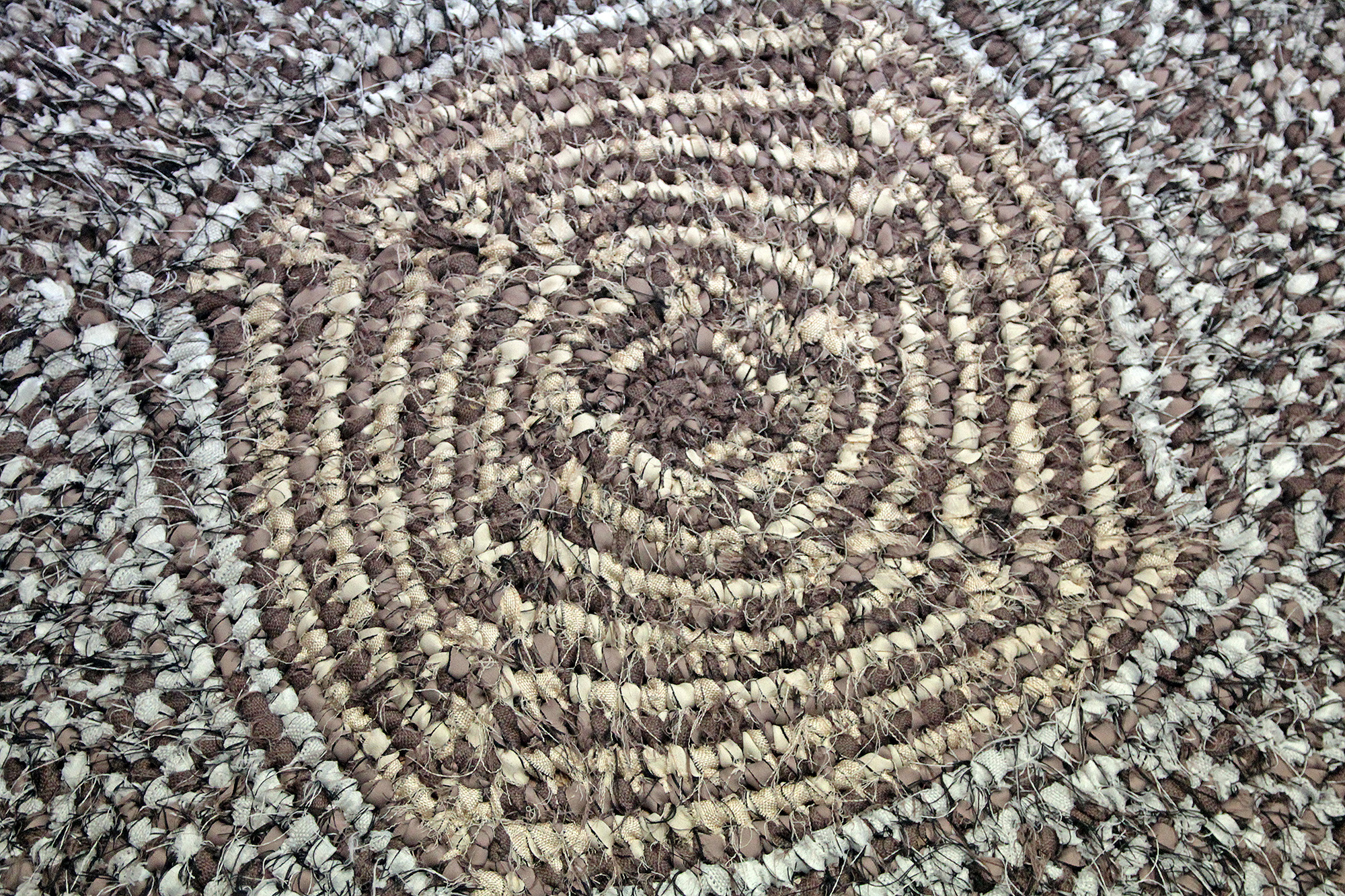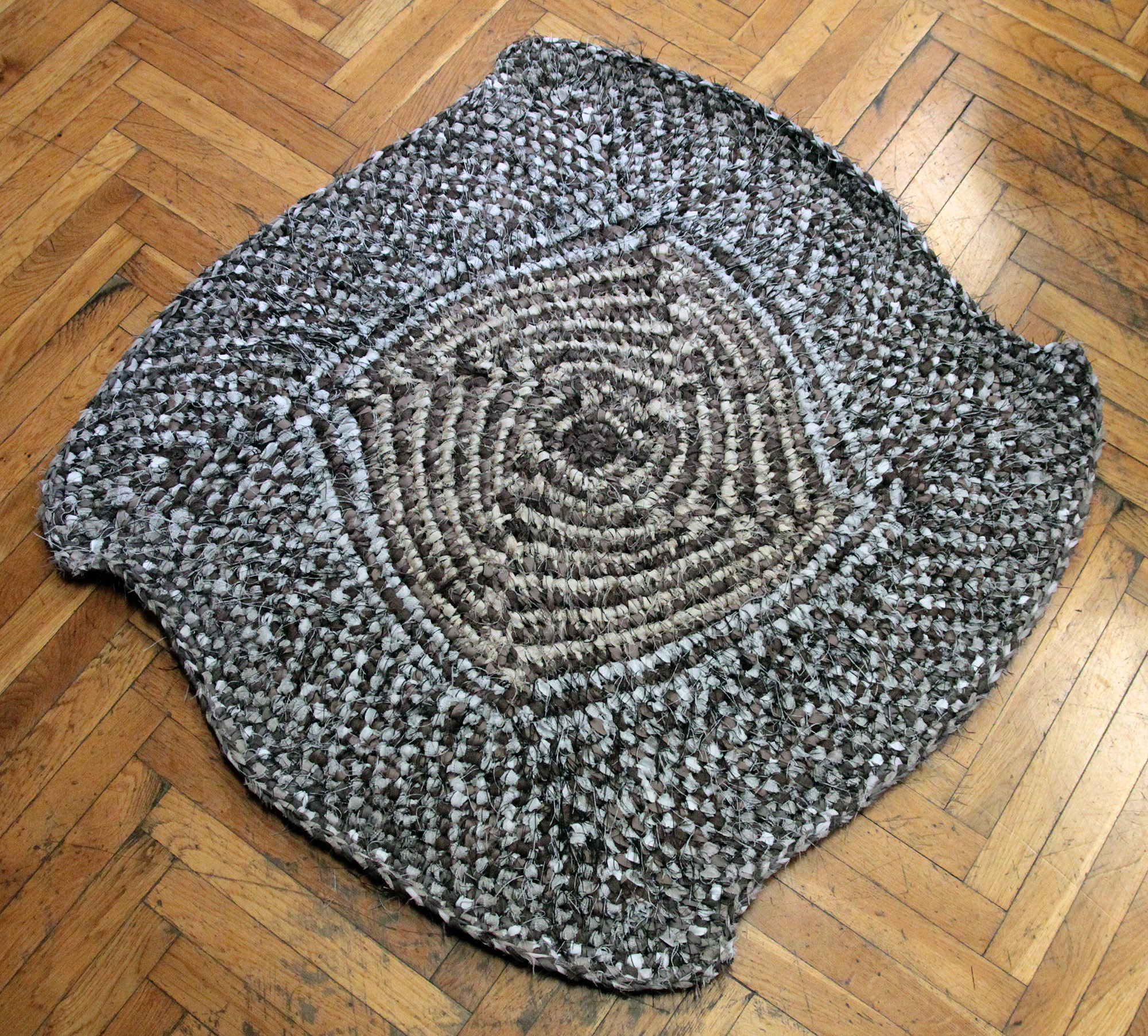 Horgolás sodratlan sötétítőfüggönyből készült, helyenként csillogó szálra.
