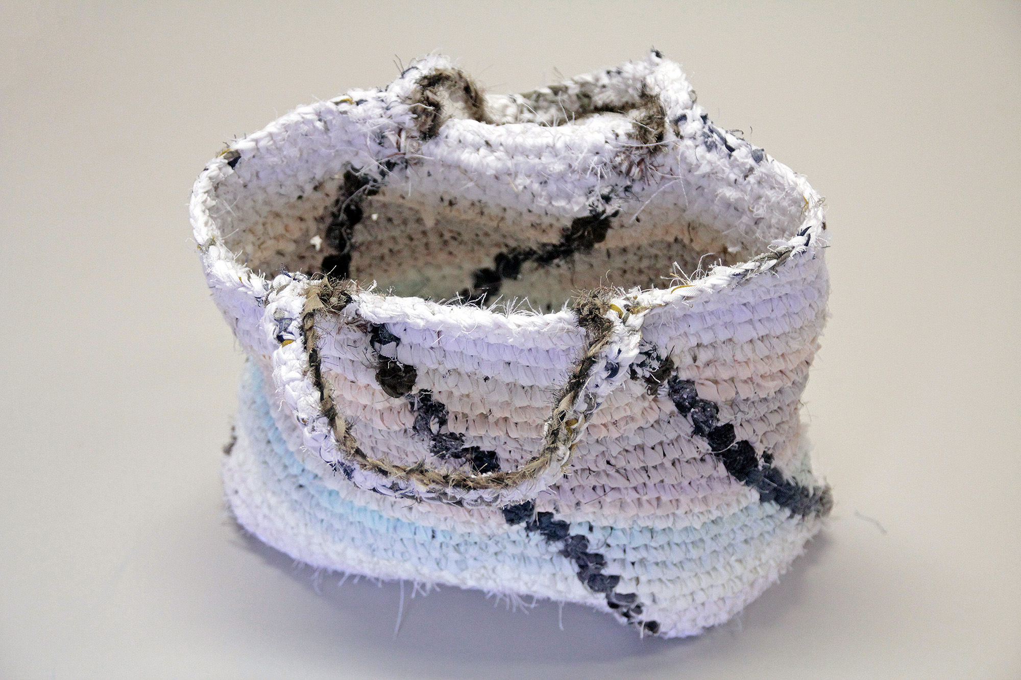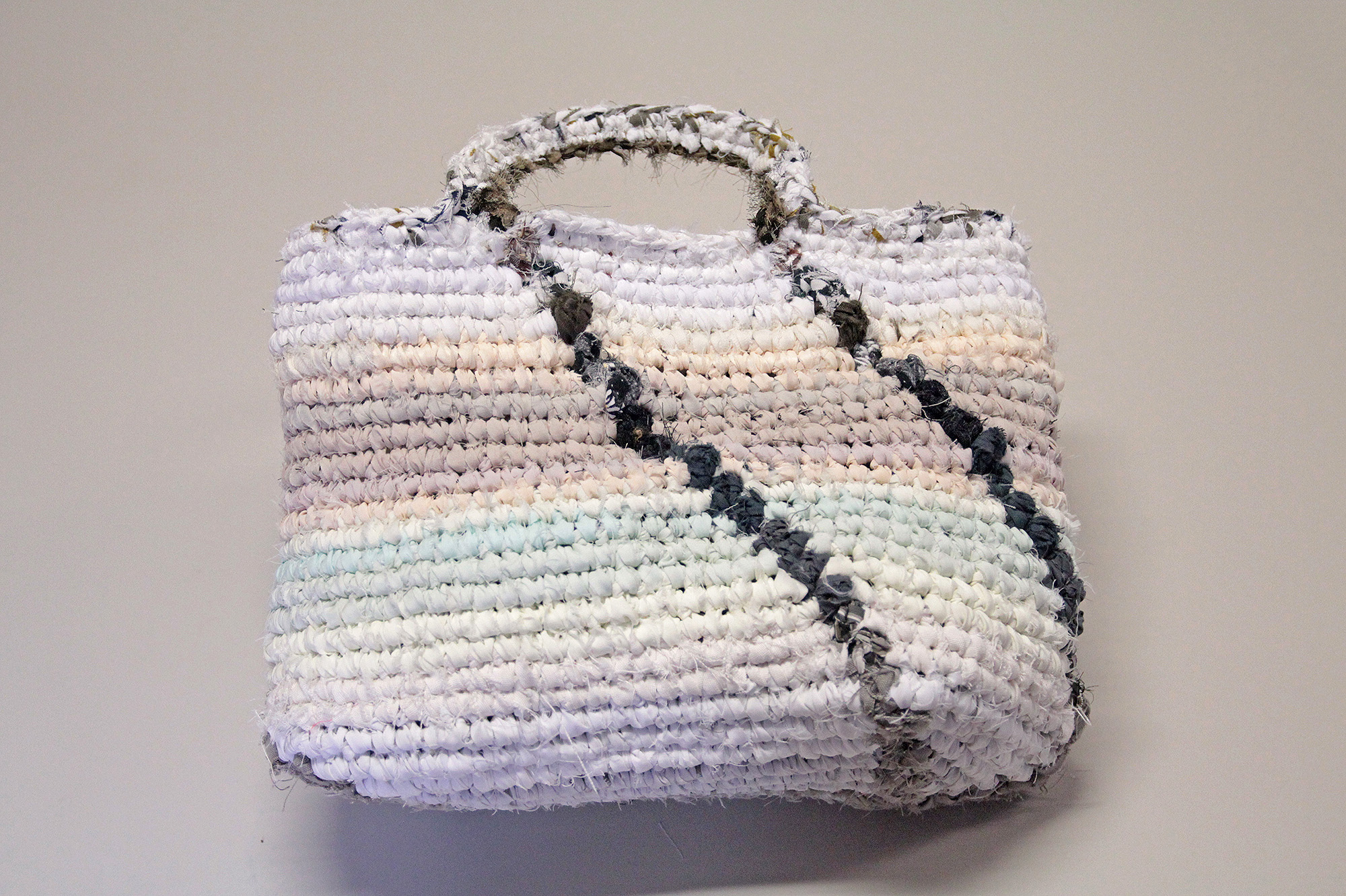 Vegyes vászonszálakból horgolt, egyrekeszes nyitott táska.