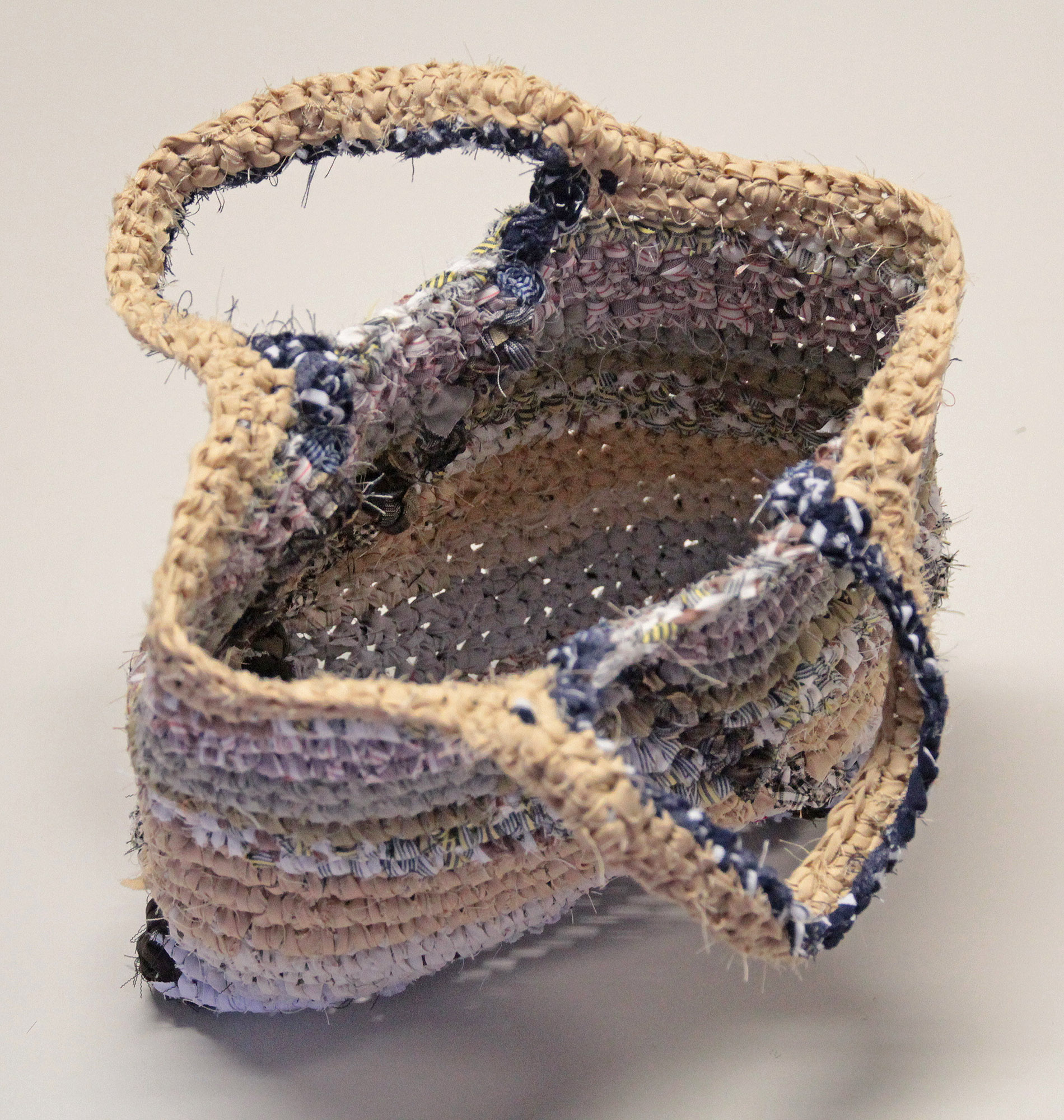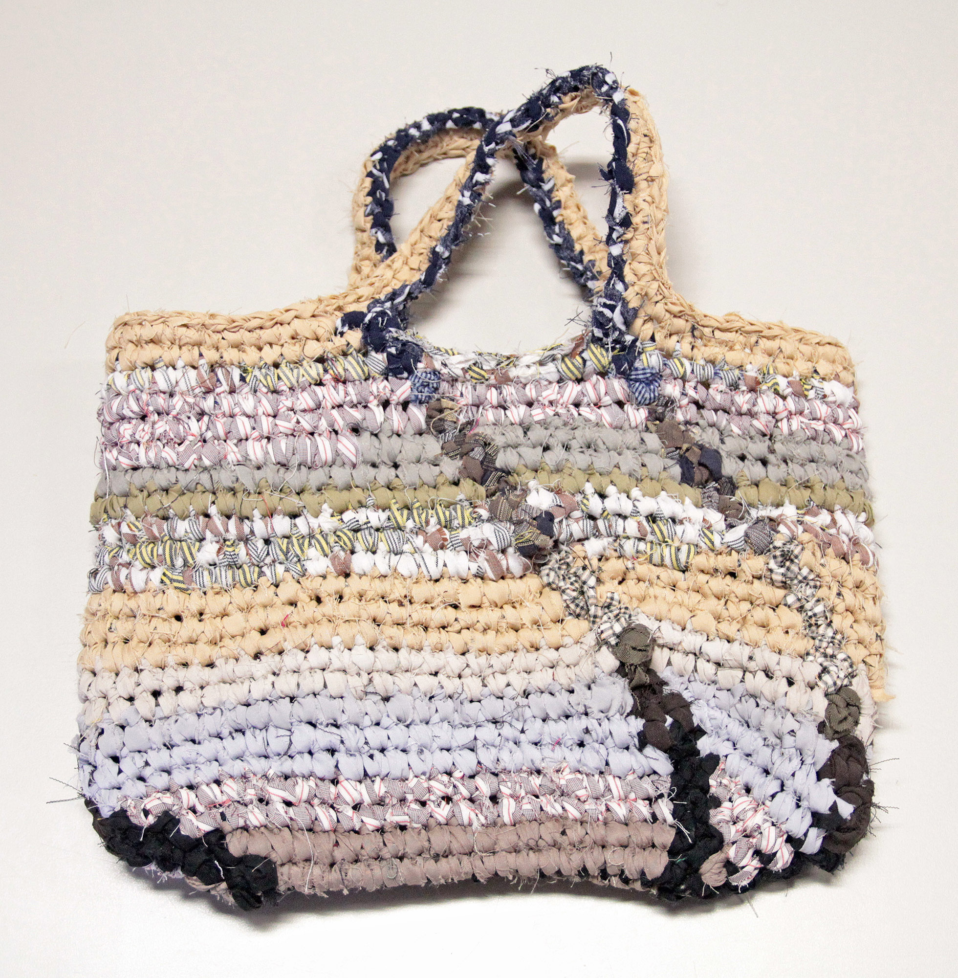 Vegyes vászonszálakból horgolt, egyrekeszes nyitott táska.