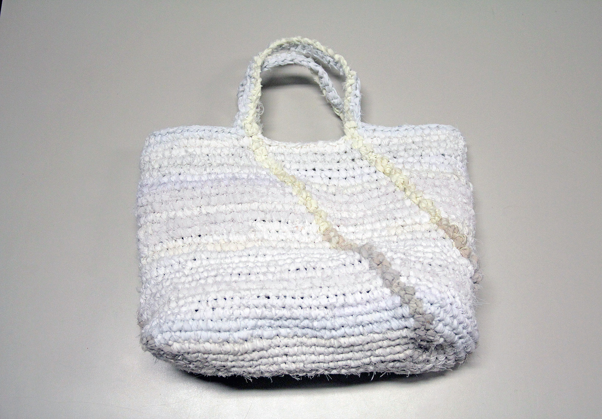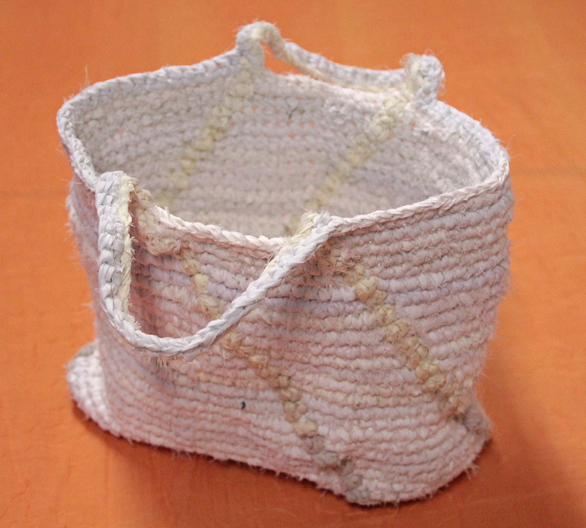Vegyes vászonszálakból horgolt, egyrekeszes nyitott táska.