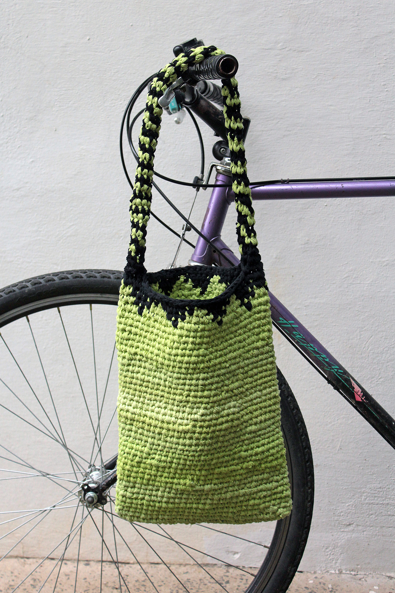 Vegyes vászonszálakból horgolt, füles szatyor.