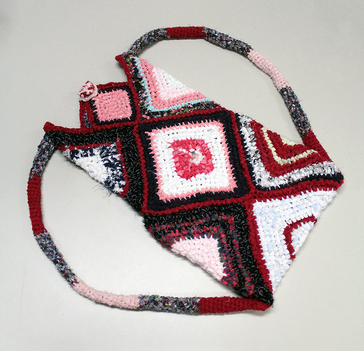 Vegyes vászonszálakból horgolt, egyrekeszes, színes hátizsák. Egy gombbal záródik.Méretei: szélessége 27 cm, magasság: 54 cm.Pántok hossza: kb 67 cm, szélessége: kb 2.5 cm.