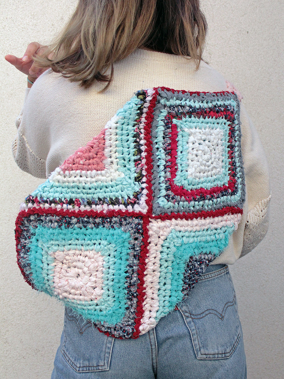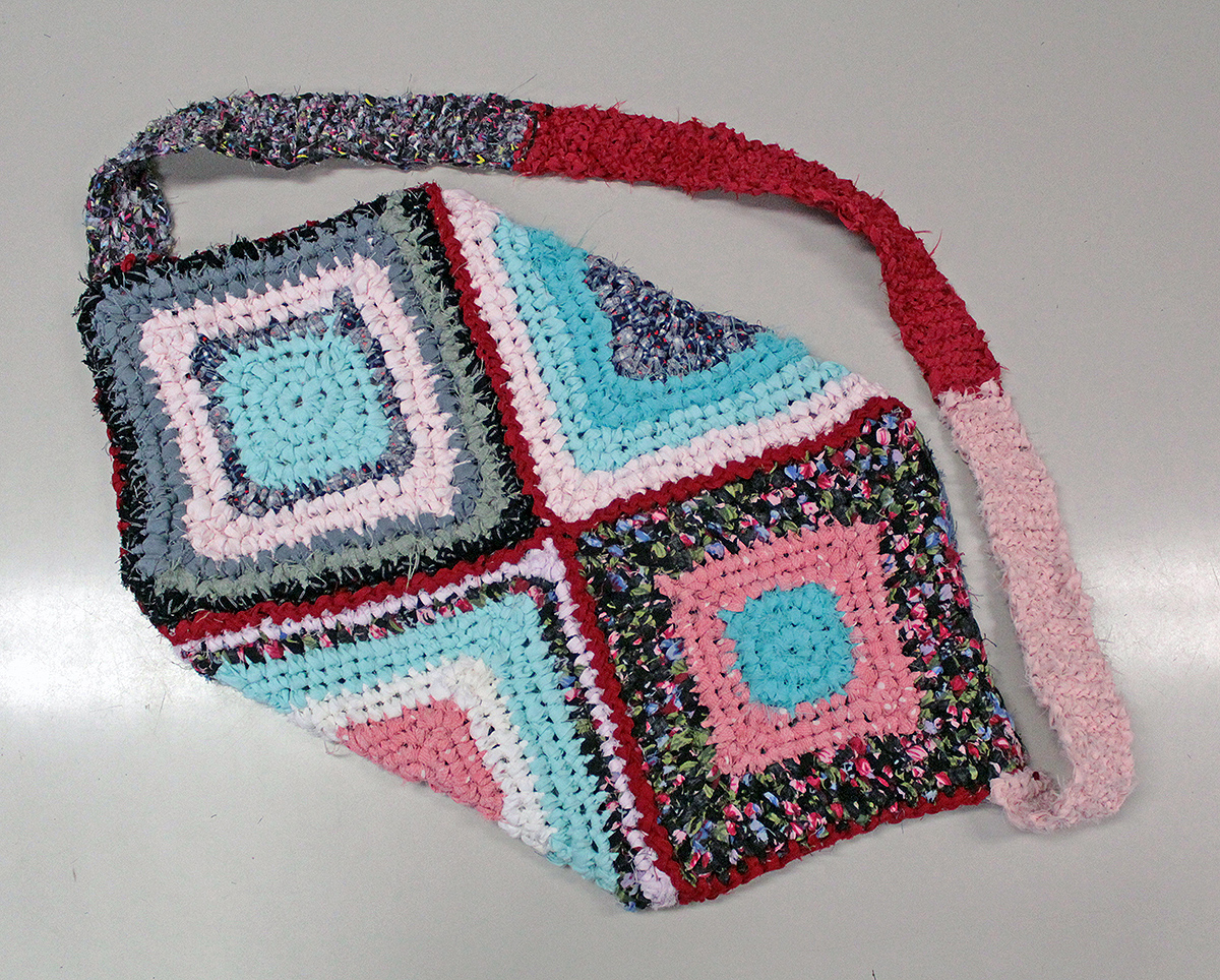 Vegyes vászonszálakból horgolt, egyrekeszes, nyitott válltáska.