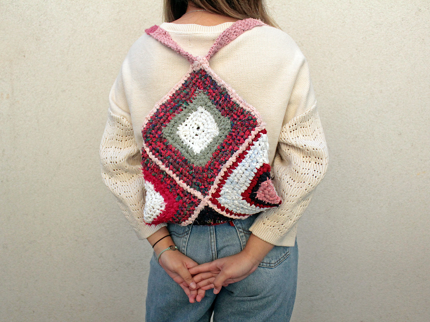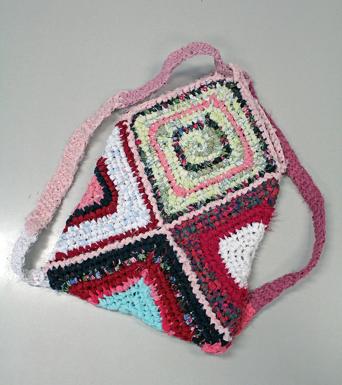 Vegyes vászonszálakból horgolt, egyrekeszes, színes,nyitott hátizsákvariálható pánttal.