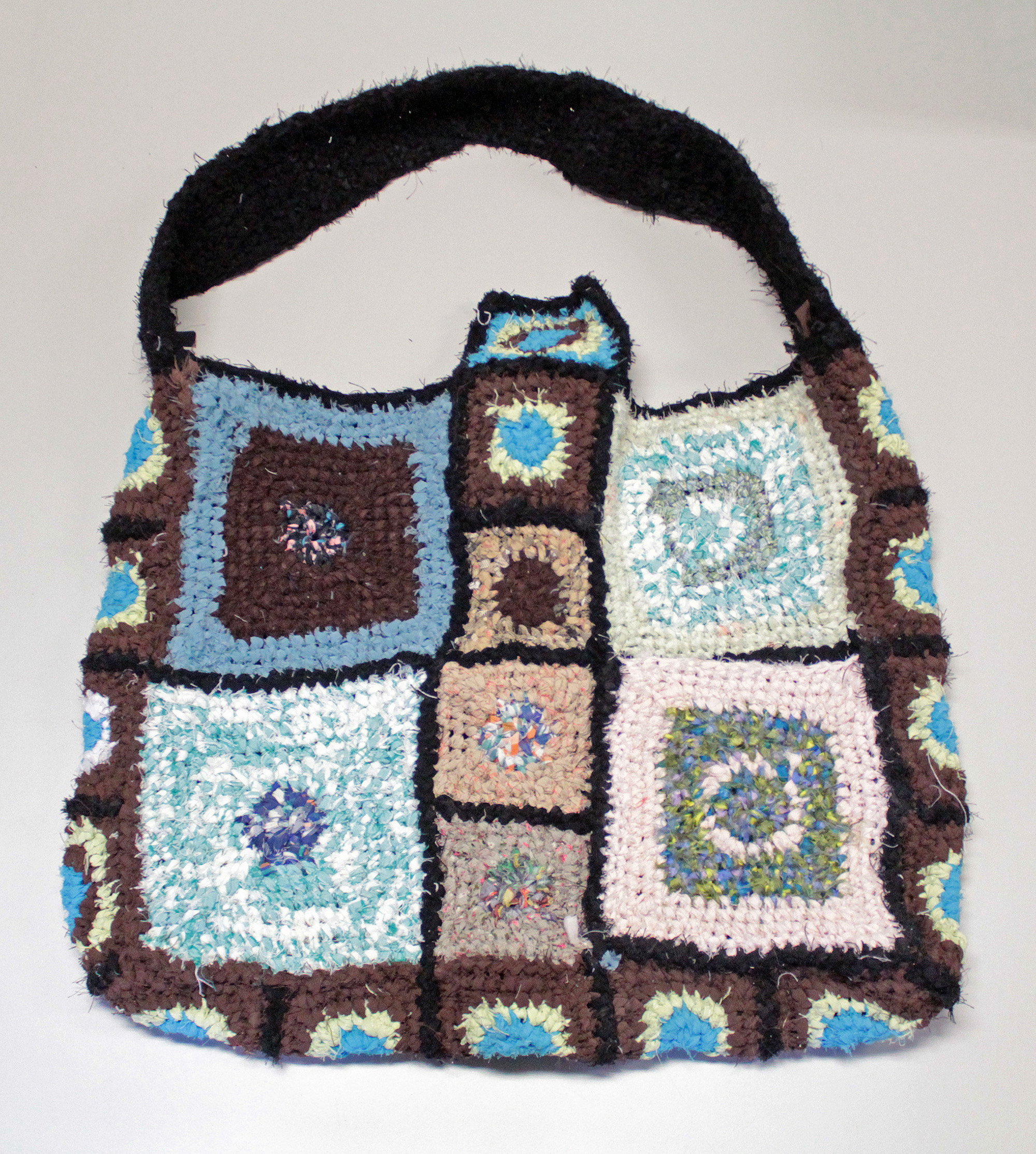 Vegyes vászonszálakból horgolt, egyrekeszes, nyitott, füles táska egyik oldalán egy külső zsebbel.