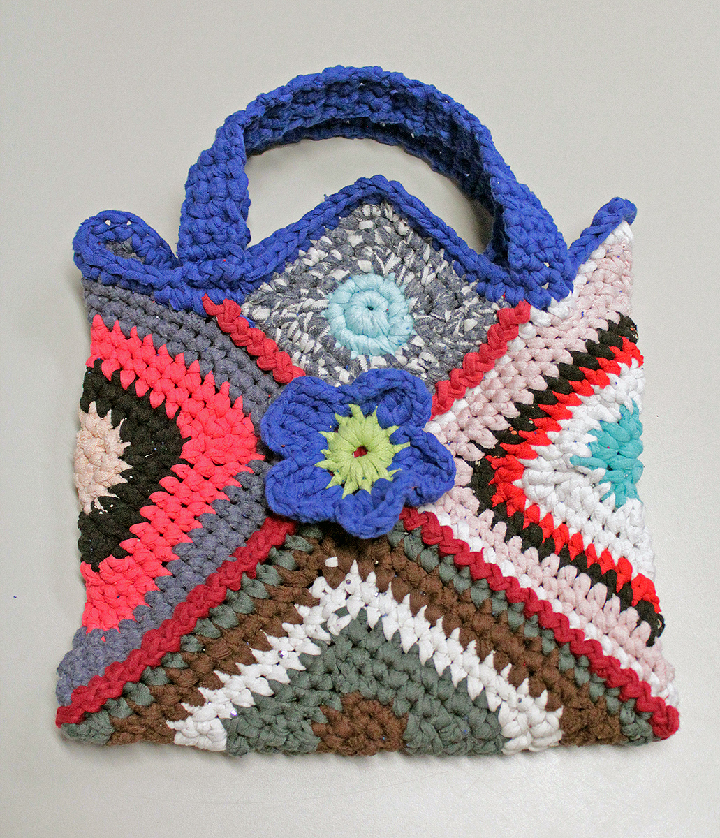 Vegyes vászonszálakból horgolt, egyrekeszes, nyitott, füles kistáska.