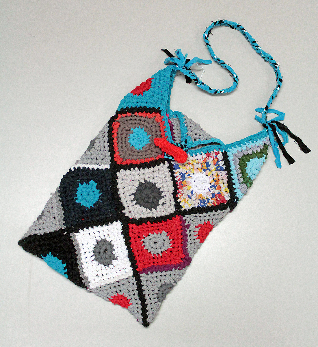 Vegyes vászonszálakból horgolt, egyrekeszes, füles szatyor.
