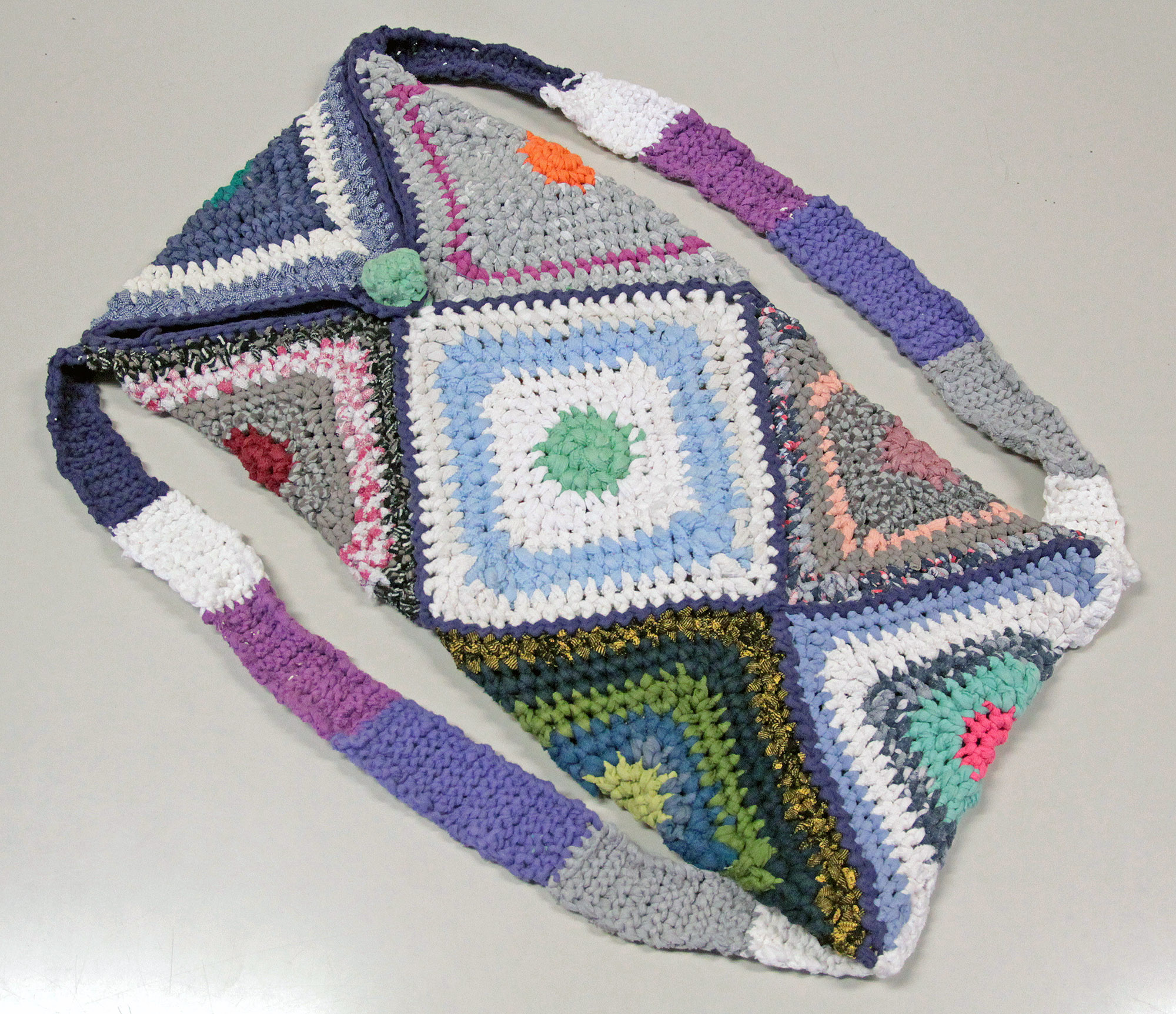 Vegyes vászonszálakból horgolt, egyrekeszes, színes, egy gombbal záródó hátizsák.